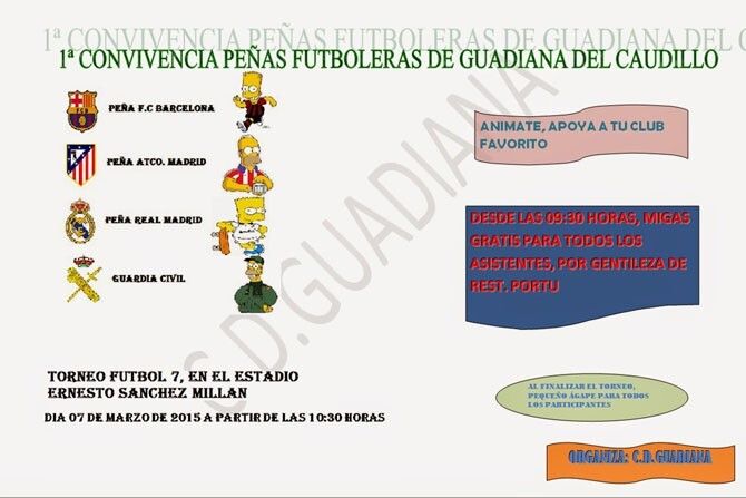 El próximo sábado 7 de marzo, en el Estadio Ernesto Sánchez Millán, tendrá lugar la 1ª Convivencia de Peñas Futboleras de Guadiana del Caudillo, organizada por el C.D. Guadiana.