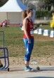 Disco Femenino que se dirigen por la pista de atletismo hasta el círculo de