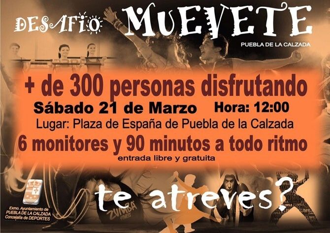 El próximo 21 de marzo a las 12 horas tendrá lugar el Desafío Muévete, una actividad deportiva que se celebrará en la Plaza de España de Puebla de la Calzada y que está organizada por la Concejalía de Deportes de dicho Ayuntamiento.