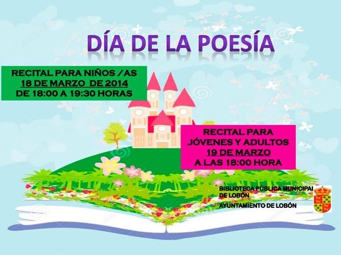 El día 18 de marzo de 18 a 19:30 horas tendrá lugar un recital de poesía para niños y el 19 de marzo a las 18 horas, un recital de poesía para jóvenes y adultos