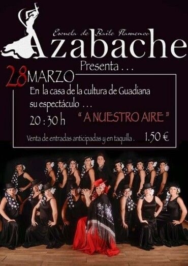 El sábado 28 de marzo, a las 20:30 horas, la Casa de la Cultura de Guadiana acoge el espectáculo "A nuestro aire" de la Escuela de Baile Flamenco Azabache.