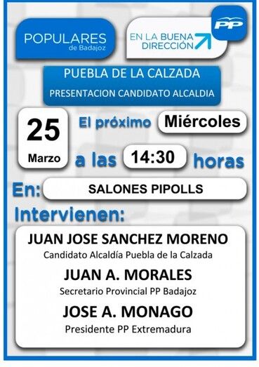 Los Salones Pipolls, de Puebla de la Calzada, acogerán el miércoles 25 de marzo a las 14:30 horas, la presentación del candidato a la Alcaldía de la localidad por el Partido Popular, Juan José Sánchez Moreno, quien estará acompañado en este acto por José Antonio Monago, Presidente del PP de Extremadura, y Juan Antonio Morales, Secretario Provincial del Partido Popular.