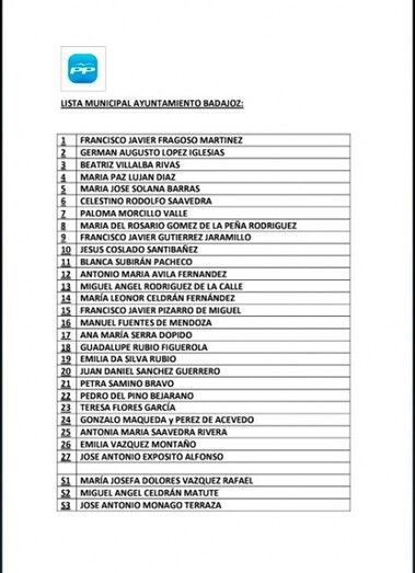 "El PP de Badajoz ha dado a conocer la lista electoral que conforma su candidatura para las próximas elecciones municipales del 25 de mayo. Una candidatura que, encabezada por Francisco Javier Fragoso, ofrece continuidad en la gestión municipal, pero también se refuerza por la experiencia y juventud que conjugan las nuevas incorporaciones a la lista.