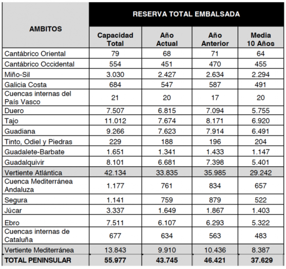 La reserva hidráulica española está al 78,1% de su capacidad total. Actualmente hay 43.745 hectómetros cúbicos (hm³) de agua embalsada, lo que representa un aumento de 121 hm3 (el 0,2 % de la capacidad
