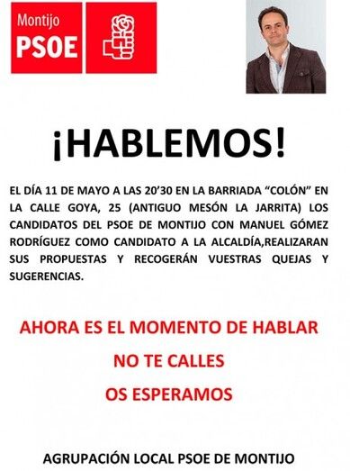 El 11 de Mayo a partir de las 20:30 horas en la barriada Colón, en la calle Goya, número 25 ( antiguo Mesón la Jarrita), los candidatos del PSOE en Montijo, con Manuel Gómez Rodríguez como candidato a la Alcaldía, realizarán sus propuestas y recogerás las quejas y sugerencias.