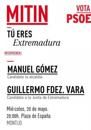El miércoles 20 de mayo, a las 20 horas, tendrá lugar un mitin del PSOE en la Plaza de España de Montijo.