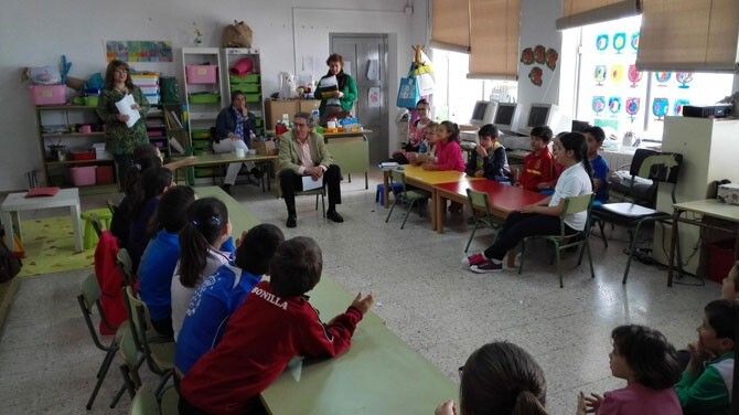 Por medio de Josefa Valle Lancho (Pepi, Representante de los padres/madres en el Consejo Escolar del Centro), con el acuerdo del Claustro de Profesores, se contactó con los poetas extremeños, de la provincia de Badajoz, Francisca Quintana Vega (Paqui, natural de Montijo) y Juan Manuel del Pozo Jiménez (Manolo, natural de Alburquerque), poetas de nuestra tierra, y se les invitó a venir a nuestro Colegio. De este modo, nos visitaron el Viernes 24 de Abril y nos recitaron poemas principalmente de cosecha propia. El alumnado y el profesorado se dividió en dos grupos: por un lado, de 11:00 a 11:45 horas, los más pequeños, alumnado de Infantil y Primer Ciclo de Primaria; y, por otro, de 12:15 a 13:30 horas, los más mayores, alumnado de Segundo y Tercer Ciclo de Primaria. Cada grupo estuvo acompañado por sus Maestros/as tutores y por el Director del Centro. Durante el recreo, de 11:45 a 12:15 horas, antes de recitar los poemas al 2º grupo, se hizo un descanso y poetas y profesorado nos tomamos juntos en la Sala de Profesores un café con un bizcocho casero elaborado para la ocasión por la mujer del Director.