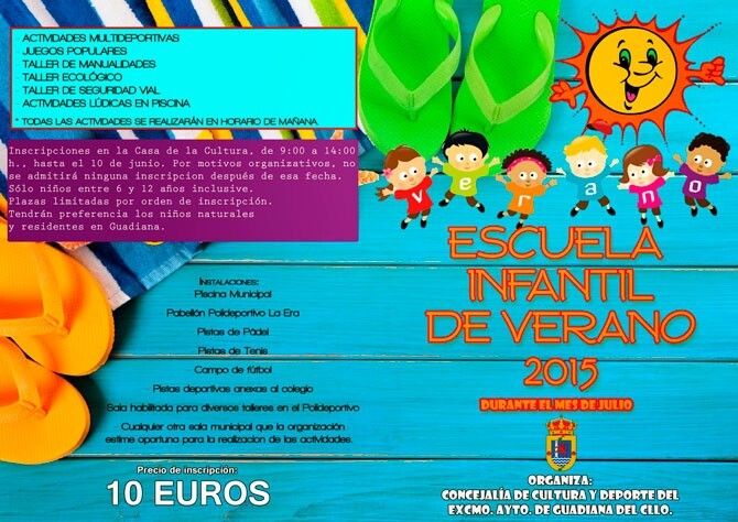 Tras el éxito que supuso el año pasado, durante las próximas vacaciones escolares la Concejalía de Cultura y Deporte del Ayuntamiento de Guadiana vuelve a organizar la Escuela Infantil de Verano, llena de actividades y talleres que harán disfrutar a todos los niños participantes durante el mes de julio.