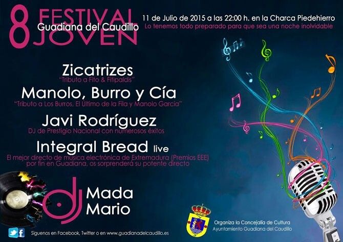 Este año, quizá más que nunca, el Festival Joven apuesta muy fuerte por la música electrónica más bailable y contemporánea, con las actuaciones de Javi Rodríguez (DJ de prestigio nacional con numerosos éxitos a sus espaldas), Integral Bread (un ascendente DJ y productor de música electrónica de proyección internacional que actúa por primera vez en Guadiana, su lugar de origen, con un potentísimo directo) y los ya conocidos DJ Mada y DJ Mario, jóvenes ya expertos en hacer bailar a Guadiana.