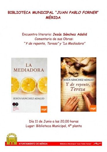 La Biblioteca Municipal cierra la celebración de sus 15 años de existencia de los clubes de lectura con un nuevo encuentro literario, en esta ocasión con uno de los escritores extremeños más reconocidos en nuestra región y en nuestro país, Jesús Sánchez Adalid. El autor va a presentar sus dos últimas publicaciones, Y de repente Teresa y La Mediadora. El primer título como homenaje a los 500 años del nacimiento de Santa Teresa y el segundo, que es su última novela, se aleja de la habitual narrativa histórica con la que el escritor nos tiene acostumbrados.