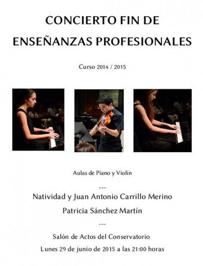 Hoy lunes, a las 21:00 horas en el salón de actos del Conservatorio de Montijo tendrá lugar un concierto a cargo de los tres alumnos del centro que finalizan sus estudios profesionales de Música en el presente curso académico.