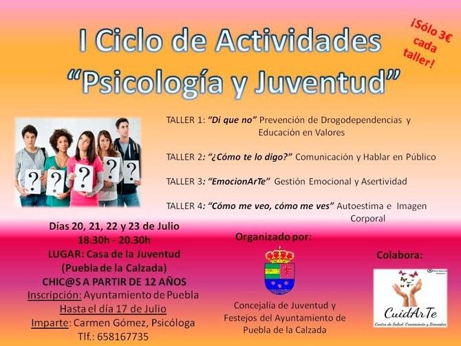 Del 20 al 23 de julio, de 18:30 a 20:30 horas, tendrá lugar el I Ciclo de actividades "Psicología y Juventud" en la Casa de la Juventud de Puebla de la Calzada.
