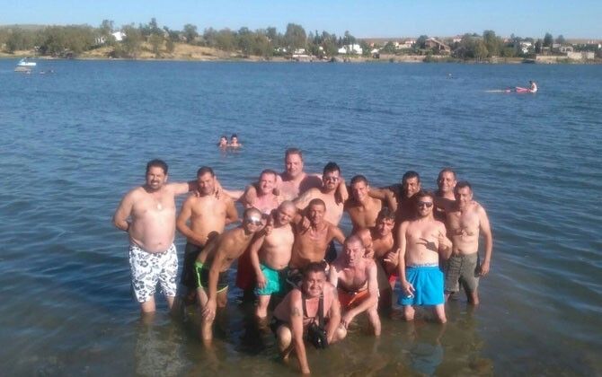 Voluntarios y usuarios de la Asociación "Camino a la Vida" de Montijo acompañados del director del Centro de Emergencia Social para personas con problemas de adicciones y/o en riesgo de exclusión social Julián Cruz, han pasado un día de ocio en el embalse de Proserpina en Mérida, el primer fin de semana después de la limpieza del embalse.