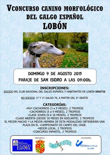 El próximo domingo 9 de agosto, a partir de las 09:00 horas, en el Paraje de San Isidro de Lobón, tendrá lugar el V Concurso canino morfológico del galgo español.