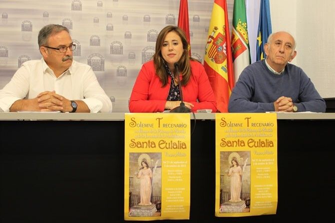 La delegada de Cultura, Ana Aragoneses, acompañada del presidente de la Asociación de la Virgen y Mártir Santa Eulalia, Luis Miguel González y del vicepresidente, Carmelo Arribas, ha presentado hoy en rueda de prensa esta edición del trecenario.