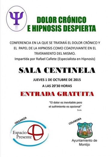 En esta conferencia se tratará el dolor crónico y el papel de la hipnosis como coadyuvante en el tratamiento del mismo y no sólo está enfocada a las personas que padecen cualquier tipo de patología, sino también a aquellos profesionales que quieran ampliar sus conocimientos, resolver sus dudas o contrastar información.