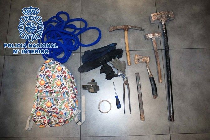 Junto al lugar en el que se encontraba el detenido fueron halladas  una  maza de un metro de longitud, una picota, un martillo, un destornillador, unas tenazas, un cortafrío y un hacha, además de un par de guantes.
