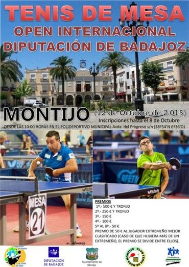 El próximo día 12 de octubre comenzara a las 10:00 horas uno de los mejores Torneos con que cuenta la Federación Extremeña de Tenis de Mesa. En esta ocasión se desplegará una infraestructura sin precedentes que cubrirá todo el pabellón municipal. Todo ello, gracias a la organización y colaboración especial del Club de Tenis de Mesa Montijo, el Ayuntamiento de Montijo, la Concejalía de deportes, Diputación de Badajoz, Junta de Extremadura, Federación Extremeña y Escuelas Deportivas Municipales.