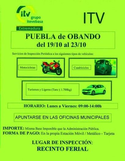 La semana del 19 al 23 de Octubre se desplazará a la localidad de Puebla de Obando, la estación móvil de I.T.V. para vehículos ligeros, turismos con peso máximo de 1.700 kg. y motocicletas.