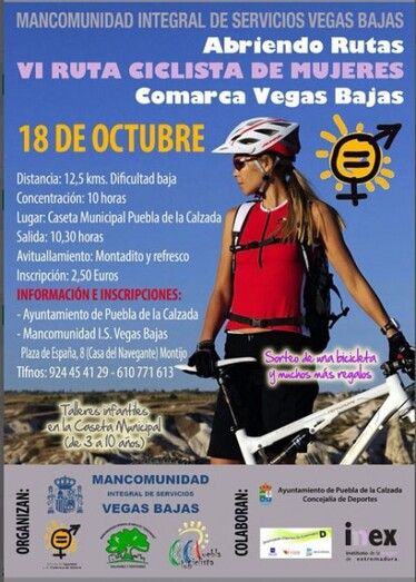 Por causas meteorológicas, debido a la previsión de intensas lluvias para este fin de semana, la VI Ruta ciclista para mujeres, organizada por la Mancomunidad I.S. Vegas Bajas y el Club Ciclista Puebla, se aplaza al día 22 de noviembre.