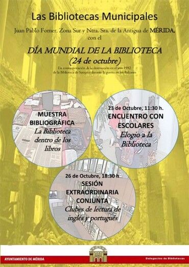 La Biblioteca Municipal “Juan Pablo Forner” celebrará este viernes el Día Mundial de las Bibliotecas, que se conmemora el 24 de octubre, con una actividad de microrrelatos que tendrá lugar en la Biblioteca Infantil a partir de las once y media de la mañana y en la que se darán cita más de cien niños de los colegios Trajano y Suárez Somonte. Habrá también una sesión de cuentacuentos especial para ellos.