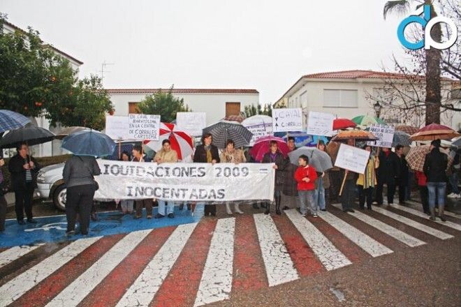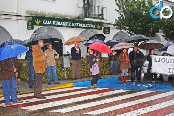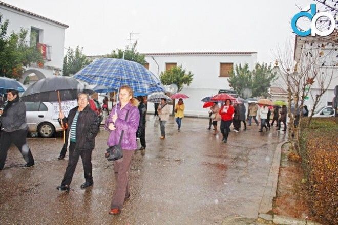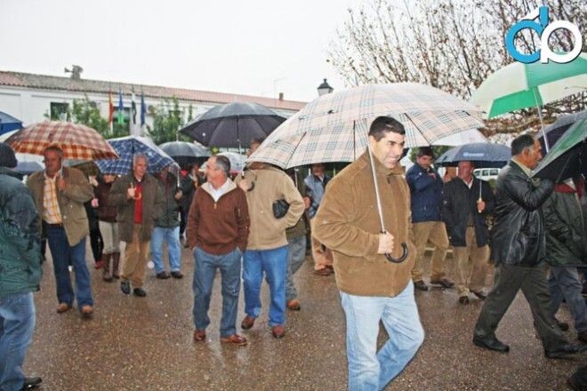 A pesar de la fuerte lluvia que caía sobre las Vegas Bajas a esa hora, la marcha ha comenzado en la Plaza de España, para, tras recorrer varias calles de la localidad, ir a las puertas de la Cooperativa, en la Calzada Romana, donde se concentraron para mostrar sus quejas.