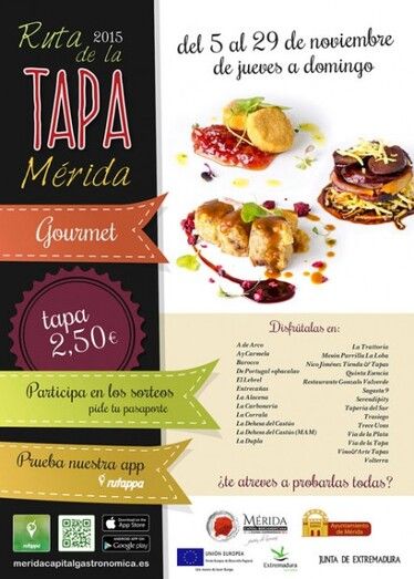 La delegación de Turismo organiza, con motivo de la capitalidad iberoamericana de la cultura gastronómica Mérida 2016 una ruta de la tapa gourmet, del 5 al 29 de noviembre.