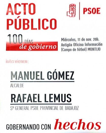 El miércoles, 11 de noviembre, a las 20:00 horas, tendrá lugar un acto público con motivo de los 100 días de gobierno del PSOE en Montijo, que se celebrará en la antigua oficina de información (junto al campo de fútbol) de Montijo.