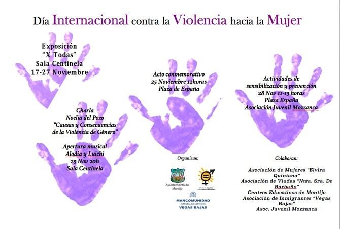 Con motivo del Día Internacional contra la Violencia hacia la Mujer, la Oficina de Igualdad y Violencia de Género de la Mancomunidad I.S “Vegas Bajas” y la Concejalía de la Mujer del Ayuntamiento de Montijo, en colaboración con: Asoc. de Viudas “Ntra. Sra. de Barbaño”, la Asoc. Mujeres progresistas “Elvira Quintana”, Asoc. Inmigrantes “Vegas Bajas”, Asoc. Juvenil Mozzanca, Cruz Roja, centros educativos de Montijo, les invitan a una serie de actividades que hemos organizado, y que a continuación se detallan: