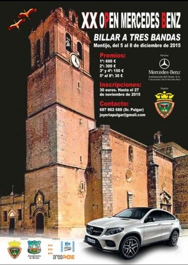 Del 5 al 8 de diciembre se disputará en Montijo el XX Open Mercedes Benz de Billar a Tres Bandas, organizada por el Club Billar Montijo y para la que se "convoca" a participar a todos los jugadores españoles y extranjeros con Licencia Federativa en vigor.