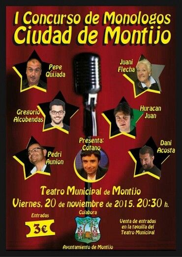 El Próximo viernes 20 de Noviembre a las 20:30 tendrá lugar un Maratón de Monólogos en el Teatro de Montijo, en el que participarán algunos humoristas locales como Juany Flecha de Montijo o Huracán Juan y Pedri Aunión de Puebla de la Calzada, además de otros de la región. También destaca Dani Acosta, venido desde Sevilla para la ocasión, así como el televisivo Juan Pedro Cotano, quien presentará la gala.