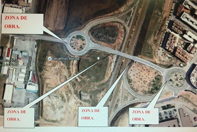 con dos carteles (CRTA CORTADA POR OBRAS Y OTRO ACCESO AL DECATHLON POR CIUDAD