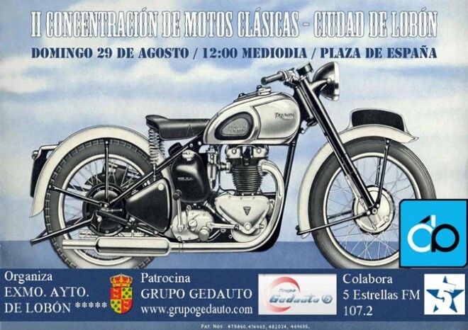 El Ayuntamiento de Lobón, en su programa de actividades de las Ferias y Fiestas de San Agustín, ha convocado un año más a los aficionados del motor sobre dos ruedas a su II CONCETRACIÓN DE MOTOS CLÁSICAS, que se celebrará el próximo domingo día 29 de Agosto en la localidad.