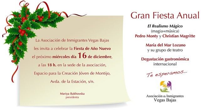 La Asociación de Inmigrantes Vegas Bajas invita a todos los vecinos que lo deseen a celebrar con ellos una gran Fiesta de Año Nuevo, que tendrá lugar el miércoles º16 de diciembre a las 18:0 horas en la sede de la Asociación, en el Espacio para la Creación Joven de Montijo, en la Avenida de la Estación.