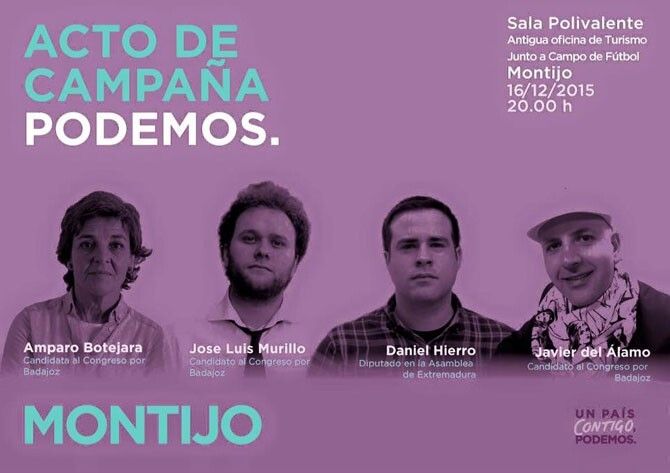 Bajo el lema “Un país contigo, Podemos”, Botejara y el resto de miembros de Podemos realizan a las 20:00 horas en la Sala Polivalente, antigua oficina de Turismo de Montijo, el acto de campaña que el partido ha organizado en la localidad.