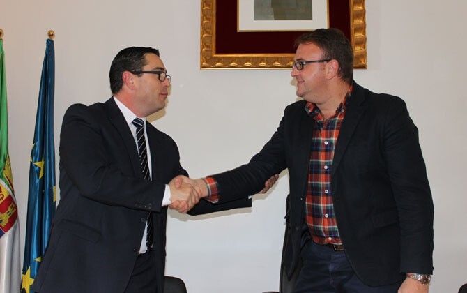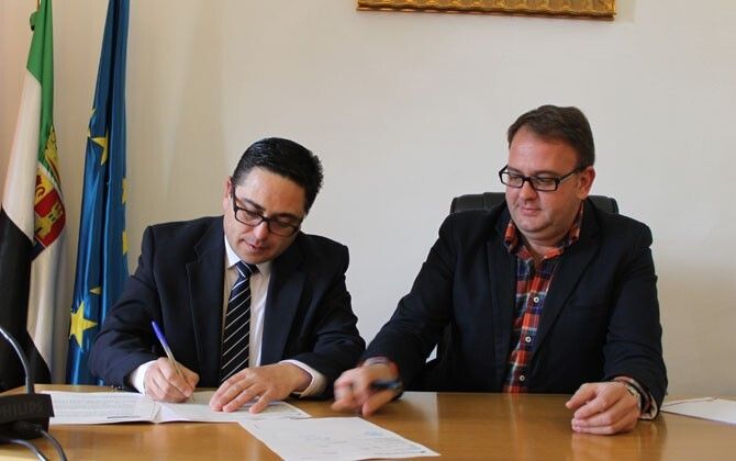 El alcalde de Mérida, Antonio Rodríguez Osuna y Lorenzo Ballesteros Pérez, director de Banca de Instituciones de CaixaBank en Extremadura han rubricado hoy el proyecto de colaboración dirigido a prestar apoyo a las familias más vulnerables de Mérida.
