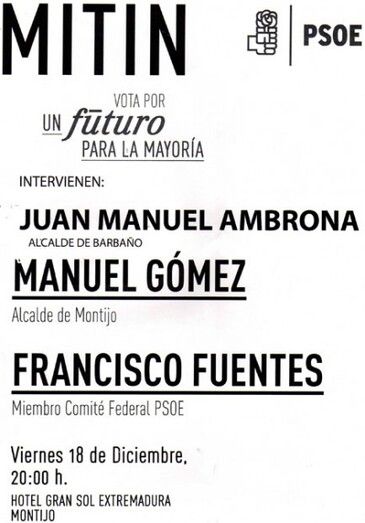 Bajo el lema “Vota por un futuro para la mayoría”, intervendrán en el acto, Juan Manuel Ambrona, Alcalde de Barbaño; Manuel Gómenz, Alcalde de Montijo; y Francisco Fuentes, miembro del Comité Federal del PSOE.