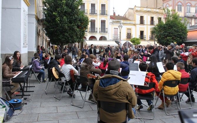La Joven Orquesta de Mérida ha actuado esta mañana en la Plaza de España, dentro del Cantacalle navideño que se está celebrando estos días junto al Mercado de Navidad de Artesanía.