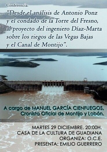 La segunda parte de la conferencia tratará sobre el proyecto del ingeniero de Caminos Manuel Díaz-Marta Pinilla, relacionado con los riegos de las Vegas Bajas y el Canal de Montijo, documentación que aborda los terrenos regables, la importancia de los canales, la distribución de cultivos y la descripción de las obras del Canal.
