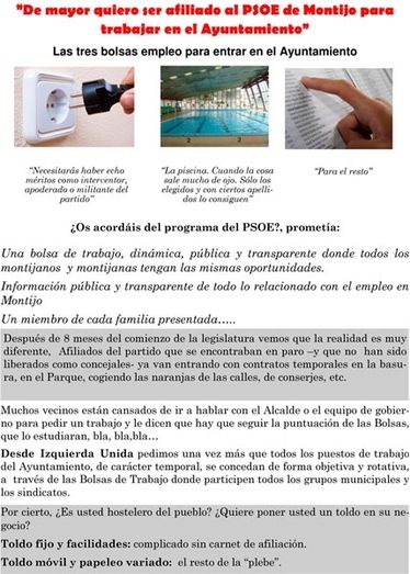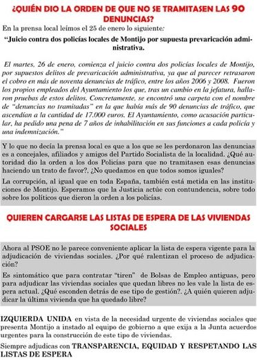 IU Montijo emite un boletín informativo en el que acusa al equipo de gobierno local socialista de privatizar el servicio de basuras, de enchufismo a la hora de adjudicar puestos de trabajo y de falta de transparencia y equidad en las listas de espera para las viviendas sociales, entre otros asuntos.