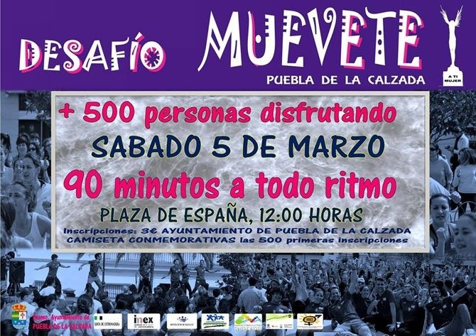 El primer fin de semana se llevarán a cabo diferentes talleres deportivos. El sábado 5 de marzo se desarrollará la marcha ‘Por ti Mujer’. A las 10:00 horas una marea humana –se estima que participen más de 500 personas- recorrerán 3 kilómetros a pie por las calles de Puebla de la Calzada hasta llegar de nuevo al punto de partida, la plaza de España. Tras un pequeño descanso comenzará a las 12:00 h. el ‘Desafío Muevete, 90 minutos bailando a todo ritmo. Y el domingo 6 de marzo a las 10:30 horas en la plaza de España comenzará el paseo ciclista ‘Abriendo Rutas’.