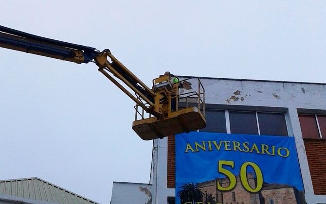 Operarios del Parque Municipal de Obras han aprovechado que el colegio de la Antigua está sin actividad escolar por las vacaciones de Semana Santa, paras repasar con una grúa los canalones, bajantes y caballetes, y aplicando tela asfáltica para eliminar las filtraciones de agua que, durante los últimos años, se vienen produciendo cada vez de cae un chaparrón.