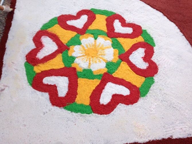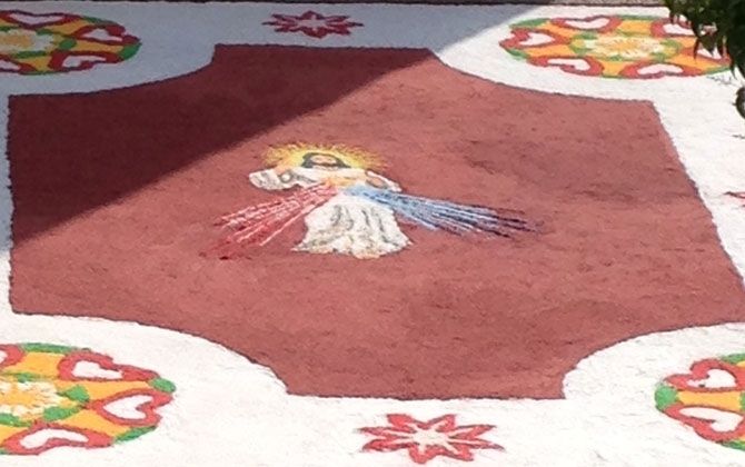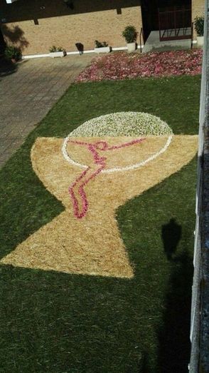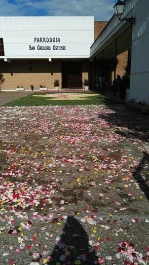 La parroquia de San Gregorio Ostiense realizó, como ya es tradicional, la alfombra con flores y hojas, para recibir de esta manera la recogida de la procesión.