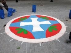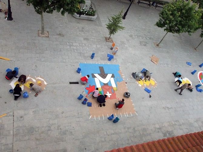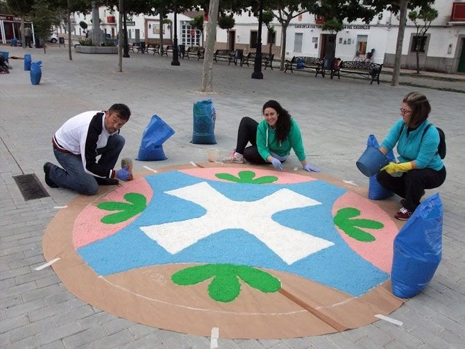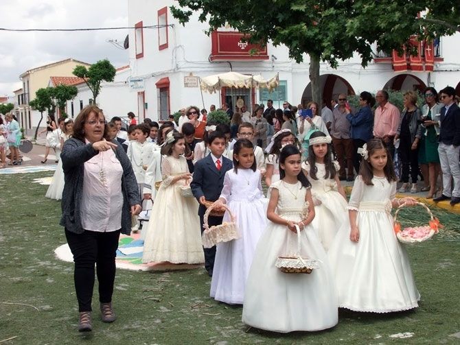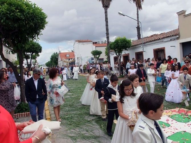 Un grupo de personas comenzó a adornar las calles desde las 6 de la mañana para que todo estuviera dispuesto a tiempo, logrando con éxito que más tarde pudieran hacer su recorrido los niños de la comunión acompañados por el párroco, varios miembros del Ayuntamiento, encabezados por el alcalde, y la Banda Muncipal de Tambores y Cornetas.