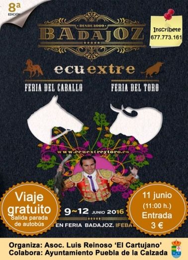 Con motivo de la feria ‘Ecuextre’ –del caballo y del toro- que se dará cita del 9 al 12 de junio en la IFEBA (Badajoz), la asociación Luis Reinoso ‘El Cartujano’ ha organizado un viaje gratuito, subvencionado por el Ayuntamiento de Puebla de la Calzada, a las instalaciones el próximo sábado 11 de junio.