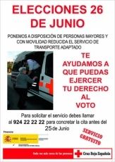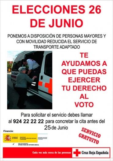 Con motivo de las próximas Elecciones Generales del 26 de junio de 2016, Cruz Roja pone en funcionamiento un dispositivo de transporte adaptado y sociosanitario destinado a personas con movilidad reducida que no tengan otra posibilidad de acudir a ejercer su derecho al voto.