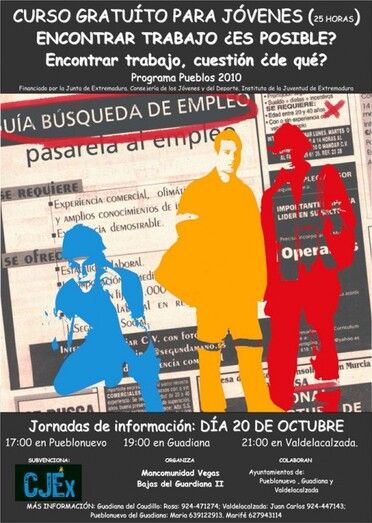 Curso gratuito para jóvenes: Encontrar trabajo ¿es posible? financiado por la Consejeria de los Jóvenes y del Deporte a traves del Programa Pueblo, organizado por la Mancomunidad Vegas Bajas del Guadiana II y en el que colaboran los Ayuntamientos de Guadiana, Pueblonuevo y Valdelacalzada.Se pueden recoger las solicitudes de inscripción en la Casa de la Cultura de las Localidades participantes.