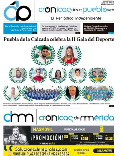 En portada aparecen también la hazaña de David Pascual y Luis Ignacio Barril, que han conseguido llegar a París en bicicleta en seis días y, el agradecimiento a los seguidores de Facebook de Crónicas de un Pueblo por el alcance conseguido en el mes de agosto.