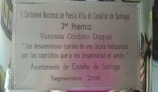 La poeta montijana Vanessa Cordero, vuelve a ganar un premio con sus versos. En esta ocasión ha sido un tercer premio en el III Certamen Nacional de Poesía Villa de Castellar de Santiago con su obra titulada “Las desavenencias cuerdas de una locura indispuesta por los caprichos que a vos despeinaron el sentir”.