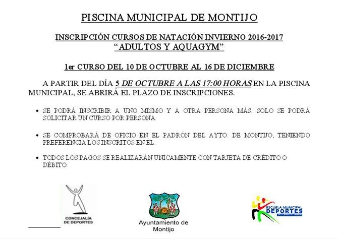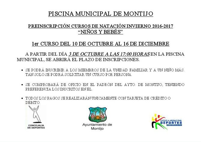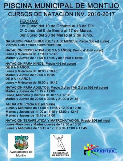 La Concejalía de Deportes del Ayuntamiento de Montijo informa sobre los cursos de Natación de invierno 2016/2017, que se inician en el mes de octubre.